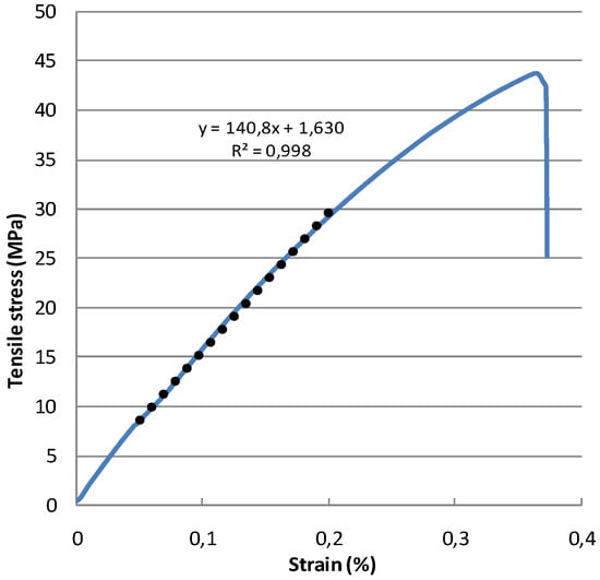 whereas, the tensile modulus is calculated (according to the ISO 527-4 standard test method) by linearising the stress–strain curve in the 0.05–0.25% strain region (the dotted line as shown in Figure 3). The strain values used to draw this stress–strain curve are the averaged axial strain in the strain field measured by DIC. Table 2 summarises the tensile test results of all composite specimen as specified in Table 1.