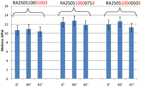 Average tensile modulus for different orientations of the specimens.