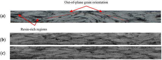 The effect of fractional mould coverage (with grain’s) on the tensile properties of aggregate-reinforced composite is evaluated by analysing the results obtained for RA250510001003, RA250510000753 and RA250510000503 panels having a mould coverage of 100%, 75% and 50% respectively. The location pattern of the 75% and the 50% mould coverage is centred which induces a macroscopic squeeze flow during the consolidation phase of the process cycle where the molten bulk material flows axisymmetrically until the mould walls are reached. During this macroscopic flow, the grains slide over one and another and the material undergoes a mesoscopic flow as well; resulting in the deformation and shear in-between the grains [30]. This mesoscopic flow tends to reduce the resin-rich regions at the grains’ tips and enhances the in-plane orientation of the grains. As a consequence, an increase in tensile strength and modulus is expected in this case. The comparison of the tensile properties between the RA250510001003 and the RA250510000753 panel shows indeed a significant increase both in the tensile strength (t(16) = 4.47, p < 0.05) from 26.97 MPa to 35.00 MPa respectively and tensile modulus (t(16) = 2.79, p < 0.05) from 10.68 GPa to 12.37 GPa respectively. A similar trend i.e., an increase in tensile strength from 26,97 MPa to 46.13 MPa and an increase in tensile modulus from 10.68 GPa to 11.95 GPa as a function of low mould coverage is observed when RA250510001003 and RA250510000503 panels are compared. This confirms the above described effects of the flow mechanism due to the mould coverage on the tensile properties. As inferred, lowering of mould coverage is beneficial to the reduction of resin-rich zones correlates with the observation of the panel cross-sections provided in Figure 8. The specimen from the RA250510001003 panel (Figure 8a) exhibits comparatively more out-of-plane grain orientation and resin-rich regions than that of RA250510000753 panel (Figure 8b) and RA250510000503 panel (Figure 8c). The mould coverage level can therefore be used as an adjustable process parameter to favour in-plane mechanical properties.