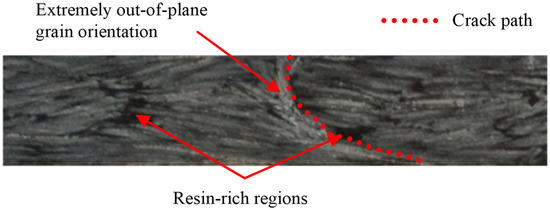 The monitoring of the strain field at different stages of loading reveals many regions where larger strain values are localised, even at low loads (Figure 4a). These high strain regions can be associated to resin-rich regions or regions of low reinforcement which are resulted from the discontinuities of the grains in the specimen. It can also be noted that the high strain regions arise mainly from the edges of the specimen. Similar result is observed by Selezneva et al. [31] while studying the tensile behaviour of chopped-tape-reinforced composites. They have suggested that those weak spots along the specimen edges are due to the shorter length of the grains along the edges as a result of the cutting of the specimen. Zolfagharian et al. [40] have observed that notches in 3D-printed thermoplastic components causes stress concentration which leads to crack initiation and ultimately to the failure of the component. During testing, the high strain regions continue to increase throughout the specimen (Figure 4b) as a function of increasing tensile stress and serve as weak spots until the weakest of them causes the final failure to the specimen. Figure 5 exhibits the fracture faces of a tensile tested specimen which reveals that the fracture path propagated throughout the specimen while avoiding the surrounding grains through delamination in the matrix. This fracture path could be attributed to stress concentrations at the vicinity of the grains as a result of material heterogeneity. The fracture faces show no fibre breakage which indicates that the failure is exclusively dominated by the matrix.