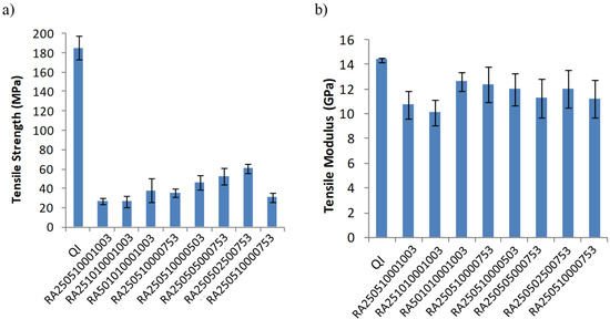 Tensile properties the composite specimens: (a) strength, (b) modulus.