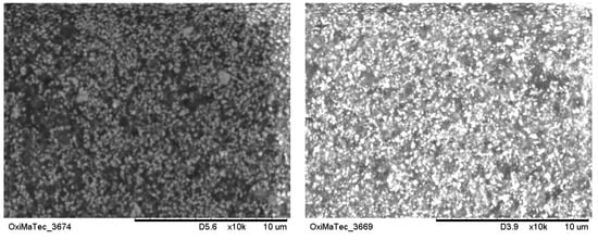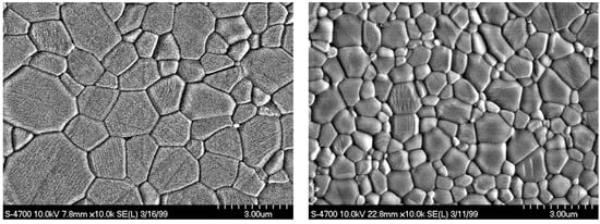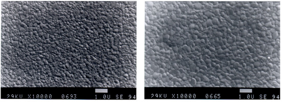 Microstructure of Y-TZP derived by coating (left) and coprecipitation (right) method (magnification 10,000×).