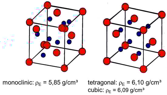 Zirconia did not play a significant role in engineering ceramic applications for a long period because it has a reversible phase transformation. While at room temperature the monoclinic phase is stable, it transfers at 1174 °C diffusion-less into a tetragonal modification. By cooling down, re-transformation into the monoclinic phase takes place. Figure 4 shows the hysteresis, which occurs during phase transformation in pure zirconia in comparison to doped zirconia with a different amount of stabilizing calcium oxide (CaO) [14]. Only after the addition of 19.5 Mol-% of CaO the expansion behaviour becomes reversible, while at lower concentrations, i.e., 5 Mol-%, does the hysteresis effect still occur. The phase transformation from monoclinic to tetragonal is combined with a re-orientation of the ions within the lattice. Due to the higher symmetry of the tetragonal modification, the density of it is 6.1 g/cm3, while in the monoclinic phase it is only 5.85 g/cm3. This means that for a non-stabilized sample, sintering takes place in the tetragonal modification and by cooling down, it re-transforms to monoclinic combined with a volume increase of about 4%. As a consequence of this, cracks are induced within the ceramic body and it is not stable. Figure 5 shows the symmetries in both modifications of the [111]-direction of the cationic lattice.
