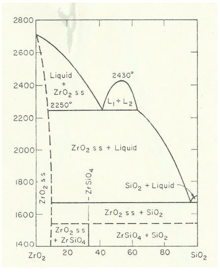 For making the zirconia powders, there are different processing methods available. The simplest method is the thermal decomposition of zircon sand, ZrSiO4. As can be seen in the phase diagram (Figure 7), it decomposes at temperatures of 1685 °C into a solid solution of ZrO2 and SiO2 [16]. However, by this approach for making zirconia, a relatively high amount of impurities remains within the zirconia. The major impurity is remaining silica. Furthermore, all rare earth and actinides remain; i.e., the accompanying uranium- and thorium oxide remains within the zirconia grains as solid solution. Due to these impurities, it is obvious that such a raw material cannot be used in biomedical applications.