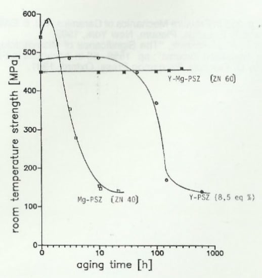 Usually, Mg-PSZ ceramics show a hardness of HV10 ≈ 1150–1200. Its fracture toughness is about 5 MPa√m. While pure Mg-PSZ is quite critical in its behaviour related to phase transformation, a system based on co-stabilisation of MgO and Y2O3 is thermodynamically much more stable. Figure 11 shows the strength decrease of Mg-PSZ and Y-Mg-PSZ after treatment at 1100 °C. It is evident that mixed stabilisation causes significant benefits compared to stabilisation with only one single oxide [22,23].