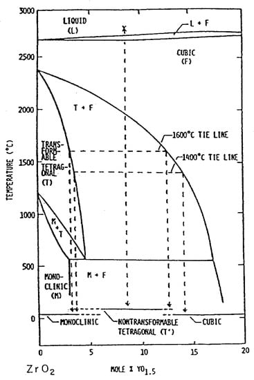 - Lange, F.F. Transformation toughening; part 3: Experimental observations in the ZrO2-Y2O3-system. J. Mater. Sci. 1982, 17, 247. [Google Scholar] [CrossRef]