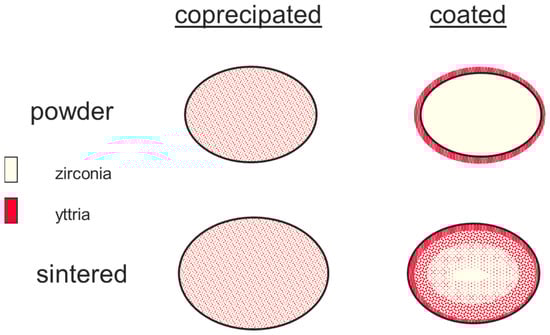 As it has been already described in detail, the carbo-clorination process also leads the very fine-grained zirconia powder (see Figure 8 right image). Although in principle yttria could be dispersed in the precursor salt, in practice this has never been done. In the late 1980s it was found that the surface properties of this zirconia raw material can be tailored by chemical treatment in order to adopt yttria onto the surface of the nano-scaled zirconia powder. This approach is the so-called “coating” process. Figure 13 shows the principle differences between these two different approaches for stabilisation of the tetragonal phase in the system ZrO2-Y2O3.