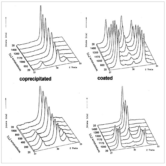 High temperature X-ray diffraction pattern of coprecipitated and coated Y2O3-ZrO2 composition.
