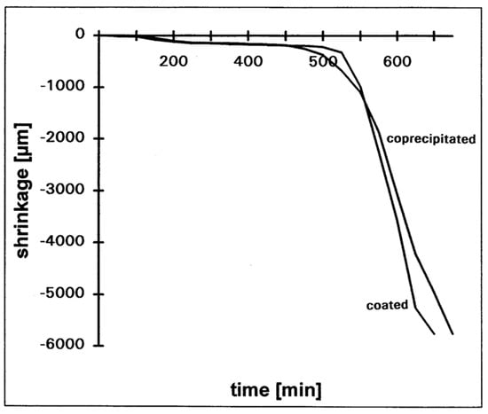 The sintering characteristics of the two Y-TZP materials are different: while the coprecipitated material starts earlier in the shrinkage, it requires higher sintering temperatures in order to reach the final density. Opposite to this, densification of coated powder starts later, but the shrinkage rate is higher and lower sintering temperatures are required. Dilatation experiments of the shrinkage behaviour are shown in Figure 16 [26]. For the coated material only 1390 °C are required in order to reach a density of 99.7%; the coprecipitated powder requires 1450 °C. Figure 17 shows the microstructure of the two materials. As it can be taken out of the picture, the microstructure of the coated material is finer.