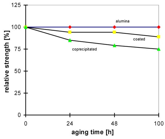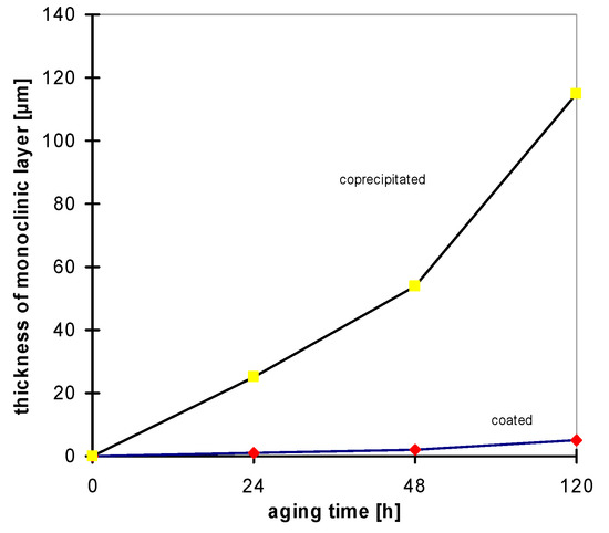 Mechanical strength properties of the materials are comparable; its mechanical strength after sintering in oxidizing atmosphere is about σ ≈ 1000–1100 MPa. Due to the yttria gradient in the coated material, its fracture toughness is higher. The real difference between the two materials is in their hydrothermal stability. Aging experiments at 135 °C with a vapor pressure of 2 bar have been made in comparison with bio-grade alumina [27]. In both cases a decrease of strength is measured; however, it is more drastic for the coprecipitated material [28,29]. The relative strength decrease is shown in Figure 18; Figure 19 contains the development of the monoclinic phase with increasing aging time, and Figure 20 shows the thickness of the corroded layer. In Figure 21 the corroded layer of the two materials is shown after 48 h treatment.