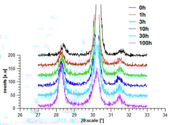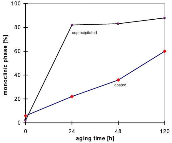 A quite interesting investigation was conducted in the early 1990s through application of high temperature X-ray investigations on the two different powders: while the coprecipitated powder already has about 75% of tetragonal phase, the remaining monoclinic phase transforms already at a temperature of about 1000 °C into tetragonal. By cooling to room temperature, the tetragonal phase remains stable [25]. Opposite to this behaviour, at the transition temperature of 1174 °C a first phase transformation from monoclinic is observed. Only by a higher temperature and time is there the transformation to the tetragonal phase. Both X-ray diffraction patterns can be seen in Figure 14. In the DTA-analysis there is also observed a small endothermal effect in the yttria coated powder at the transition temperature of 1174 °C (Figure 15). This grants proof of a slightly diffusion controlled phase transformation by yttria.