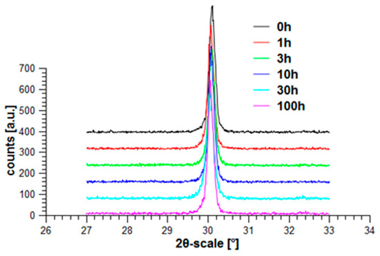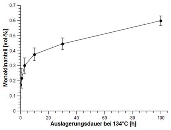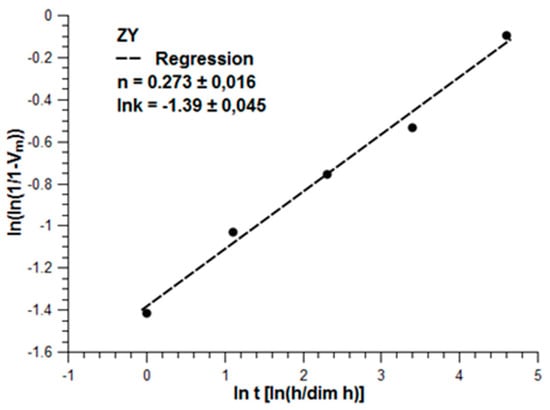 Although Y-TZP based on coated zirconia has a higher stability, when the coprecipitated materials are made in a proper way, they also fulfill the requirements for being used as dental implants [30]. Because of the higher fracture toughness and its improved hydrothermal stability, coated ceramics are preferred. They are already on the market in the premium segment applications. Recent experiments related to the hydrothermal stability (treatment at 134 °C up to 100 h in an autoclave system) have shown its superior behaviour related to aging (Figure 22). Aging according to the linear drawing shows a parabolic behaviour (Figure 23). By Mehl–Avrami–Johnson drawing the linearity is demonstrated (Figure 24). The gradient is n = 0.273 ± 0.016 and lnk = −1.39 ± 0.045, which corresponds to a velocity constant of k = 0.25 h−1 [31]. Compared to Chevalier, aging of ZY is significantly slower than in coprecipitated Y-TZP [32].