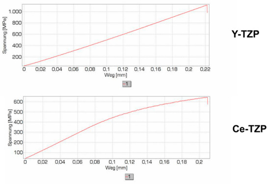 In order to enhance the fracture toughness further, we have analysed the stress-strain behaviour of Y-TZP and Ce-TZP (both based on coating technology). Figure 35 shows the results obtained. While in Y-TZP we have linear-elastic behaviour, in Ce-TZP there is a plastic deformation.