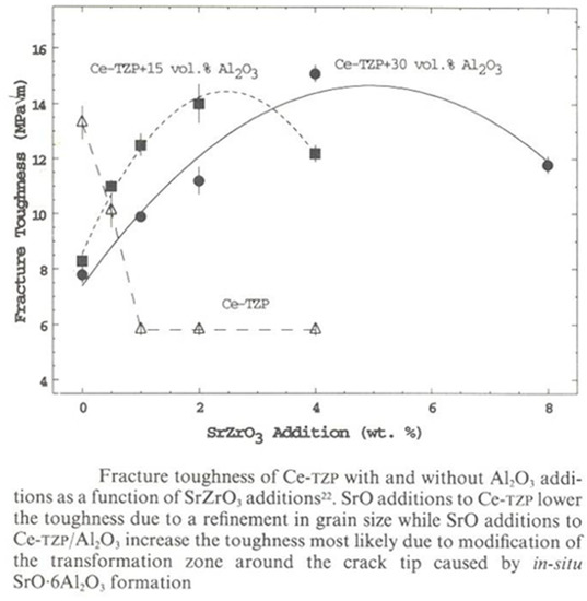 First investigations in the system Ce-TZP/SrO/Al2O3 have been made by Cutler et al. [37]. They have found a significant increase in mechanical strength in composites based on a Ce-TZP matrix and containing 15 Vol-% and 30 Vol-% of alumina, where about 30% of this addition contained hexagonal platelets of SrAl12O19. Normally, Ce-TZP has as mechanical strength of about 400 MPa, while the materials made by Cutler et al. showed 725 MPa. Hardness increased as well from 950 to 1350, while fracture toughness decreased slightly from 12.5 MPa√m to 11 MPa√m. Figure 36 shows the influence of the SrO amount, which is relevant for the platelet formation with respect to fracture toughness for two different amounts of alumina addition to the Ce-TZP matrix.