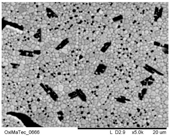 Meanwhile, the material composition has been optimized further. In addition, the raw material has been substituted by a nanoscaled zirconia powder, derived from direct synthesis of zircon-tetra-chloride with water steam. This optimisation work finally leads to a material with excellent mechanical strength of σ = 1100–1200 MPa measured with 4-point bending test, a fracture toughness kIc = 12–14 MPa√m and a hardness of HV10 = 1250. The microstructure of this optimized material is shown in Figure 39. Within the zirconia matrix there are globular alumina particles and platelets homogeneously distributed.