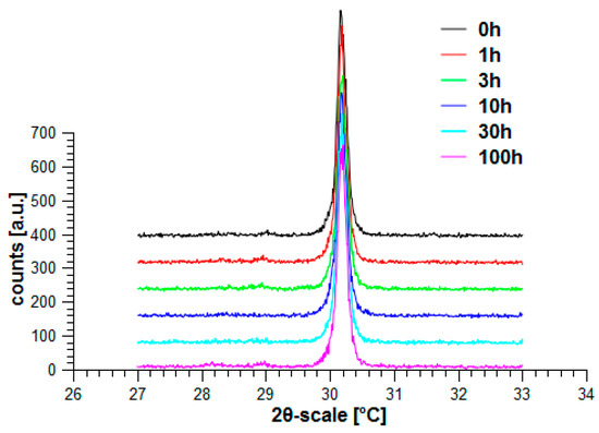 Both materials, ZCA10P and ZA05P, have finally been treated under hydrothermal conditions in the same way, just as ZY has been treated. Figure 40 shows the result obtained for ZCA10P (Ce-TZP/LaAl11O18) and Figure 41 the results obtained for ZA05P (Y-Ce-TZP/Al2O3/LaAl11O18). Opposite to ZY, which already has a significantly higher hydrothermal stability compared to conventional Y-TZP based on co-precipitated powders, there is no phase transformation.