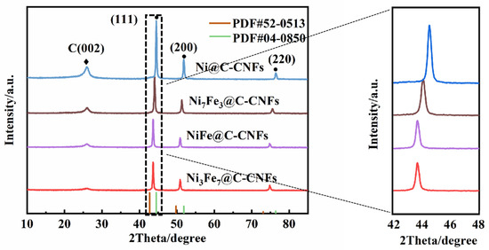 The controllable synthesis and compositions are confirmed by XRD measurements as Figure 2. Compared with the diffraction peaks of Ni and Fe, the diffraction peaks of NiFe alloy shift to some extent, which proves the formation of the alloy structure. The Ni3Fe7@C-CNFs samples showed characteristic peaks at 43.7°, 51.0°, and 74.8°, corresponding to the (111), (200) and (220) faces of the NiFe alloy, respectively. Except for the characteristic diffraction peaks corresponding to face centered cubic phase alloy, there are no other diffraction peaks, which proves that there are only single-phase alloys. The magnified portion of XRD pattern in the 2 θ range of 42–48° is provided on the right. The strongest diffraction peak shifts slightly at a small angle in a regular trend with the change of alloy composition, which proves that the lattice constant changes due to the formation of ideal alloy structure. All the composites show a major peak at 2 θ = 26°, corresponding to the typical (002) plane of graphitic carbon.