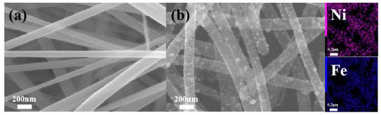 After mixing the nitrate solution and the PVP uniformly, the precursor of NixFey@C-CNFs can be formed after electrospinning for 12 h. As shown in Figure 3a, the SEM morphology of the prepared precursor was characterized, from which the produced nanofibers have a diameter of about 100 nm. The surface of carbon nanofibers is smooth and its morphology is uniform. Figure 3b shows that the precursor remains fibrous after high temperature carbonization, at which point the fiber becomes a highly conductive carbon material. Carbon nanofibers have the advantages of small size, large specific surface area and large aspect ratio. Therefore, electrons and protons can transfer in a controlled direction. However, compared with the precursors before high temperature treatment, the surface of the nanofibers is no longer smooth. It can be clearly observed that both the inner and surface of the carbon nanofibers are formed into round alloy particles. The nano-alloy particles adhere uniformly, and there is no obvious agglomeration of the alloy particles. At the same time, to determine the distribution of each element in the prepared sample, part of the region was selected for mapping detection in the experiment. The Ni and Fe elements in the sample are evenly distributed, and there is no obvious element agglomeration, indicating that the formation of single-phase alloys as shown in the illustration.