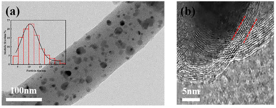 (a) TEM image (the inset shows Particle size distribution); (b) HRTEM image of Ni3Fe7@C-CNFs.