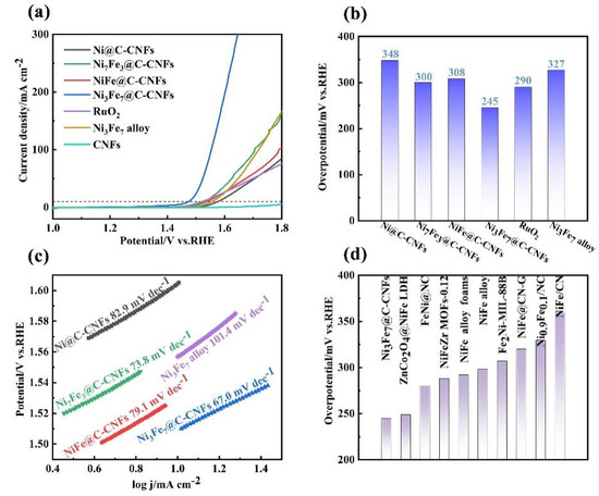 (a) LSV polarization curves after iR correction; (b) The overpotentials obtained from polarization curves at the current density 10 mA cm−2; (c) The corresponding Tafel plots; (d) Comparison of overpotentials at 10 mA cm−2 of Ni3Fe7@C-CNFs with reported literatures.