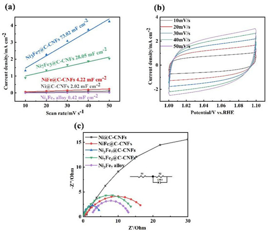 The source of the differences between NiFe alloy catalysts with different Ni/Fe ratios in OER activity can be further explored through the change of electrochemical active area. Since the electrochemical surface areas (ECSA) are proportional to the electric double layer capacitance (Cdl) of the electrode, the ECSA can be expressed by Cdl. The CV curves of Ni3Fe7@C-CNFs at different scanning rates are shown in Figure 6a. The others are shown in Figure S1. All samples were subjected to CV cycle under the same conditions, and the electrochemical active area could be obtained by data processing and fitting (Figure 6b). Compared with the others catalysts, the electric double layer capacitance of Ni3Fe7@C-CNFs is the largest, which is 73.02 mF cm−2. Large electrochemical active area can provide abundant active sites for catalytic reaction. How graphene can enhance their performance can be further explored through the change of electrochemical active area. Ni3Fe7@C has the larger electrochemical active area than Ni3Fe7 alloy, indicating that electrons transferred from the internal metal to the outer layer graphene, activating more active sites, to improve its OER activity. Subsequently, the electrochemical impedance spectroscopy (EIS) of the samples was measured to further explain the difference of charge transfer ability between different catalysts. The surface kinetics and conductivity of the catalyst can be analyzed by impedance spectroscopy. All samples show a small charge transfer resistance Rct, and its change trend is consistent with the polarization curves of LSV, Tafel slope and the electrochemical surface areas of the corresponding electrode. Ni3Fe7@C-CNFs has the smallest charge transfer resistance in comparison with others, which means that it has faster interfacial charge transfer efficiency and reaction kinetic rate. From the Figure 6c, Ni3Fe7 alloy without graphene sample exhibited a larger charge transfer resistance, which means it has lower interfacial charge transfer efficiency and reaction kinetic rate and has a negative effect on OER catalytic activity. The above comparison results between Ni3Fe7 alloy and Ni3Fe7@C-CNFs show that the electronic coupling between the internal alloy and graphene accelerates its kinetic rate, which is also one of the main reasons for the improvement of its OER activity.