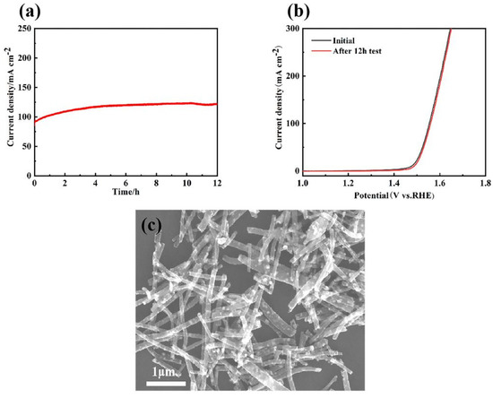 Researchers have tended to focus on decreasing the overpotential when designing catalysts, while focusing less on the stability. In addition to the catalytic activity, the stability is also a necessary condition to judge the performance of the catalyst. We tested the i-t curve of the sample Ni3Fe7@C-CNFs by potentiostatic method, as shown in Figure 7a. It can be seen from the figure that the current density of the sample hardly decreased after 12 h test at high current density of 100 mA cm−2. The LSV curve before and after stability is almost consistent, which indicates that Ni3Fe7@C-CNFs has excellent stability (Figure 7b). The stability of the sample after scanning electron microscope characterization, as shown in Figure 7c. The morphology of the carbon fiber-loaded alloy was not destroyed after the stability test, which showed that Ni3Fe7@C-CNFs had excellent properties and morphological stability. The good stability results from the core-shell structure. The carbon shell can not only prevent the agglomeration of the nanoparticles, but also separate the inner alloy from the strong alkaline environment of the electrolyte. Therefore, its excellent activity and good stability make it possible to replace the practical application of noble metal based electrocatalysts in OER.