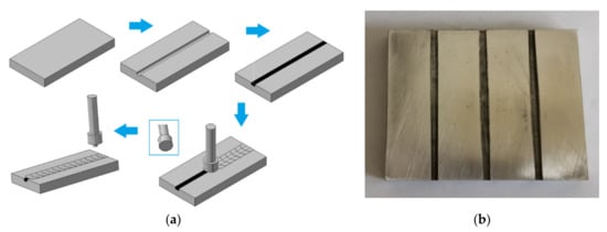 In the groove method, three stages can be distinguished: (1) cutting a groove in the sample and filling it with the reinforcing material, (2) closing the groove containing the reinforcing material using a pinless tool, and (3) the distribution of the particles in the matrix using a tool with a pin [48]. A diagram of the groove method is shown in Figure 1.