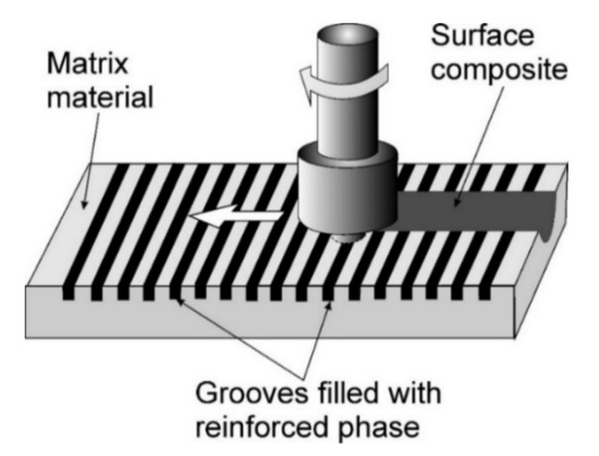 The key issue in the production of composites using FSP is the method of introducing the reinforcing phase into the matrix. Currently, there are a number of solutions and methods allowing effective introduction of the reinforcing phase to the surface layer of the modified material and formation of the composite microstructure in it. The best-known methods are the groove method, the hole method and direct-friction stir processing (DFSP). FSP technology can also be used to modify the microstructure of finished composites, e.g., in order to eliminate manufacturing defects, homogenize the material and improve the properties of the composite.