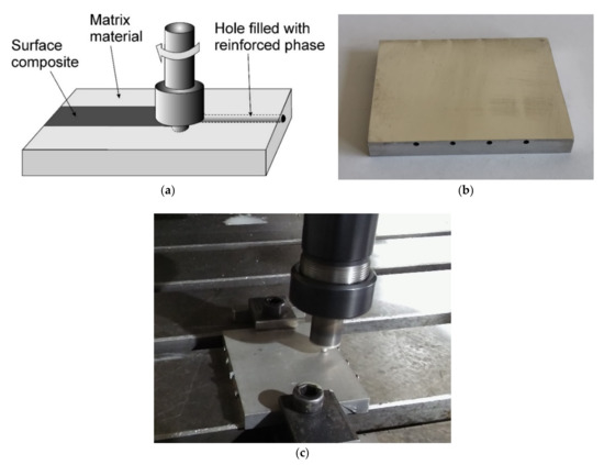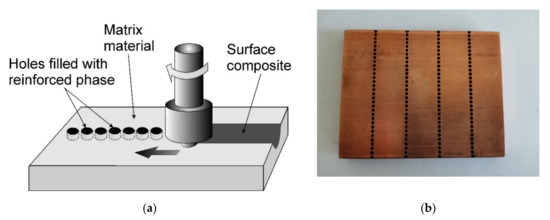 The reinforcement material is usually added in the form of a powder. In most cases, only one powder is added to the groove; however, hybrid surface composites can also be produced via friction stir processing [40]. In some studies, thin sheet metal is the form of reinforcing material that is used.