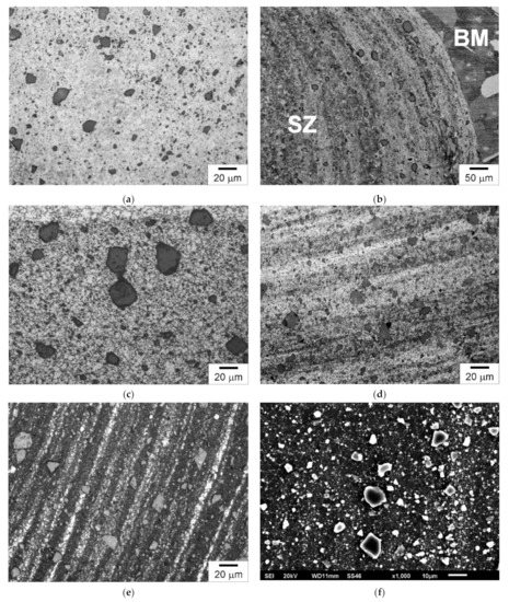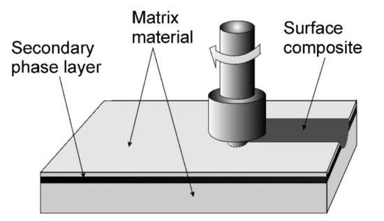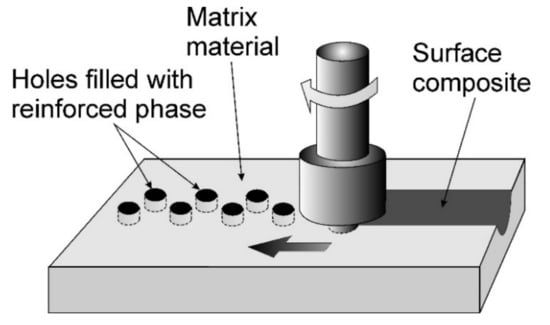 FSP leads, among others, to strong grain refinement in the modified material owing to dynamic recrystallization, which results in improvement in the functional properties of the material [13]. The only source of heat in FSP is friction, thanks to which the technology is classified as environmentally friendly. As friction stir processing is a solid-state process, there are no melting or solidification defects such as porosity or thermal cracks [14]. It is also worth adding that although friction stir welding and processing had been developed mainly for light non-ferrous metals [15], there are many reports of the successful friction stir processing of various grades of steel [16,17]. It is worth emphasizing that FSP technology can be used not only to modify the microstructure of the material, but also to produce surface composites. For the first time, FSP technology was employed to produce surface composites by Mishra et al. [18] On a sample made of 5083Al aluminum alloy, they applied a thin layer of SiC particles, which were previously mixed with methanol, and the layer formed in this way was dried in air. Subsequent FSP treatment allowed the SiC particles to be introduced into the plasticized matrix and a surface composite to be produced. Thanks to FSP, defects that form in the matrix alloy during, e.g., the casting process, can be effectively eliminated [19].