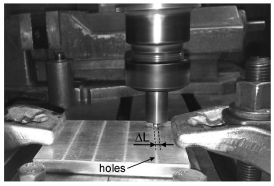 One of the variants of the hole method is a solution with an offset line of holes in relation to the moving tool. Iwaszko et al. [67] demonstrated that during FSP, it is advantageous when the axis of the moving tool is shifted in relation to the axis of the holes by a certain value ΔL (Figure 6). In this case, the pin of the tool does not sink centrally into the chambers filled with the reinforcing particles, but only partially engages the pin with the powder filled hole. As a result, the contact of the pin with the reinforcing phase takes place to a large extent with the participation of the matrix, already plasticized in the meantime, which partially neutralizes the abrasive effect of the reinforcing phase on the pin and reduces the intensity of pin wear. In the above variant, however, it is necessary to apply a two-stage treatment because after a single pass of the tool, only preliminary and insufficient mixing of the reinforcing phase with the matrix is achieved. Proper mixing of the reinforcing phase with the matrix takes place only during the second pass, during which the tool pin moves centrally along the hole line. This solution gives the best distribution effect of the reinforcing phase, while reducing pin wear. Less wear on the pin, in turn, results in reduced contamination of the modified surface layer by material coming from pin wear. The use of the variant with an offset line of holes also reduces the risk of uncontrolled movement of the modifying material beyond the modified area, which is most intense when the rotating pin enters the reinforcement material. In [62], the 7075 aluminum alloy in the T6 state was subjected to FSP. Holes with a diameter of 2 mm and a depth of 4.5 mm were drilled in the surface of the sample. In the first phase, the tool axis was at a distance of ΔL = 2.5 mm in relation to the axis of the holes; in the second phase, the tool pin moved centrally along the hole line. As a result of the applied treatment, uniform dispersion of the reinforcing phase, i.e., SiC particles in the metal matrix of the alloy, was obtained; the difference between the place with the highest concentration of SiC particles in the mixing zone and the place with the lowest concentration did not exceed ~ 10%.