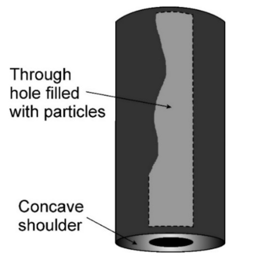 The DFSP method was first used by Huang et al. [72] to form a composite microstructure in the surface layer of the AZ31 magnesium alloy. As the reinforcing phase, the authors used SiC particles with an average diameter of 1 µm. The authors used a special pinless tool with a concave shoulder and a through-channel drilled centrally in the tool, through which the reinforcing material was fed by gravity into the modified zone (Figure 9). The through-hole of the DFSP tool was also the container for the reinforcing material. This channel was filled with the reinforcing phase before processing, after which the reinforcement particles were introduced into the working zone using the force of gravity. Huang et al. [72] showed that when using DFSP technology it is possible to obtain a uniform and homogeneous dispersion of the reinforcing phase particles in the composite layer.