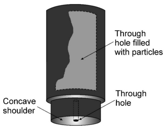The DFSP method was also used by Almazrouee et al. [48] The main goal in this case was to produce a composite microstructure in the surface layer of the 1100 aluminum alloy. In order to introduce the reinforcing phase, i.e., SiC particles, into the metal matrix, the authors developed a two-part tool consisting of an inner threaded hollow cylindrical body and a pinless head containing a shoulder with a hole in the center (Figure 10). Both parts of the tool were screwed together. The use of a two-part tool made it possible to easily replace the powder dosing head with another one adapted to the currently performed processing. Microstructural tests of the composite layer obtained in this way showed the uniform distribution of the SiC particles and their very good adhesion to the aluminum substrate with a simultaneous increase in the hardness of the material. The authors did not observe significant wear of the tool as a result of its contact with the hard SiC particles, which was explained by the soft nature of the processed material, i.e., the 1100 aluminum alloy. Due to the fact that the developed tool was pinless, the thickness of the composite layer was, unfortunately, relatively small as it was only 300 µm after using a head with a 6 mm diameter hole.