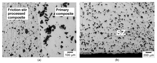 Composites reinforced with particles and produced by casting methods are most often subjected to FSP. For example, in [74], FSP was applied to a gravity cast composite with an AlMg10 matrix, reinforced with SiC particles. FSP was made using a pin tool with a threaded side surface. As a result of FSP, favorable changes in the microstructure of the material were found, in particular, strong refinement of the matrix grain, in addition to the disappearance of casting defects and agglomerates of SiC particles abundant in the starting composite. The treatment was also accompanied by a more uniform distribution of SiC particles in the metal matrix and their strong refinement, combined with a change in the shape of the particles from polyhedral and sharp edged to more equiaxed. As a result of the refinement of the SiC particles, their number per unit area clearly increased, as it was more than twice higher in the FSPed alloy than in the starting material (Figure 12). Moreover, favorable changes in the microstructure of the composite increased the hardness of the material by about 35%.