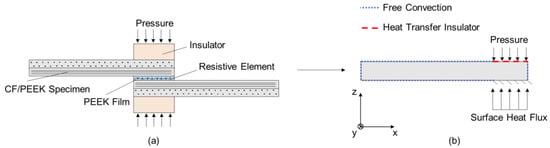 A simplified resistance welding process is modeled using the commercial Finite Element code ABAQUS®. Two coupon specimens according to ASTM D1002 standard are used as adherends. To reduce the computational time for the modeling procedure, both adherends are assumed to behave similarly, so that only one coupon specimen is modeled with adequate boundary conditions. The schematic resistance welding process based on a typical experimental setup and the corresponding simplification for modeling is shown in Figure 1.