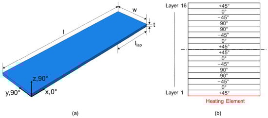 The part is modeled using quadratic hexahedral, coupled temperature–displacement elements. The geometry illustrated in Figure 1 is similarly implemented in the width direction to create a 3D model. No edge effects in the width direction are taken into account, as the considered specimen is assumed to be cut from a plate so that constant conditions can be applied. The heat generated during welding is applied directly to the joining zone of the coupon specimen and is simplified as a surface heat flux. It results from the joule heating effect of a resistive element (i.e., carbon fibers, steel mesh) and is assumed to be uniformly distributed at the overlap area. The pressure for consolidation is assumed to be constant in length and width direction and is applied directly to the specimen. The thermal boundary conditions are represented by free convection due to ambient air temperature at the free surfaces, while the area between the specimen and the insulator is modeled by heat transfer from carbon fiber-reinforced polymer (CFRP) to wood, which is a typical insulator material in this context. The joining surface is assumed to be fixed in all degrees of freedom. The specimen consists of a [+45°/0°/−45°/90°]2S quasi-isotropic layup. Every single unidirectional layer is represented as one quadratic hexahedral coupled temperature-displacement element in the thickness direction. This results in an overall thickness of t = 2 mm. The specimen’s length is l = 101.6 mm, and the width is w = 25.4 mm. The overlap length is assumed to be llap = 25.4 mm. Furthermore, the global coordinate system definition (Figure 2a) as well as the layup used for the simulation (Figure 2b) need to be addressed. While the global system is characterized by the x, y, and z coordinates, the local layer system is represented by the I-coordinate in the fiber direction, the II-coordinate in-plane perpendicular to the fiber direction, and the III-coordinate out-of-plane perpendicular to the fiber direction.