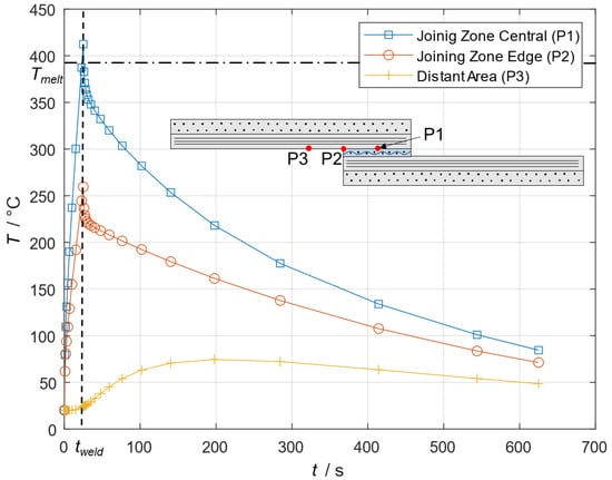 As mentioned in the cited publications, the weld’s quality is highly affected by the temperature magnitude and distribution in the joining zone. The performed welding process simulation leads to time-temperature data for the considered component so that the temperature of every single element at a certain time during heating and cooling can be assessed. In Figure 3, the temperature data of three selected measuring points (P1, P2, and P3) are presented. All three points are located in the mid-plane in the width direction of the specimen. It can be seen that the melting temperature of the matrix (Tmelt = 390 °C) is reached after tweld = 25 s in the middle of the joining zone (P1). Furthermore, it can be noticed that with this welding parameter configuration, only a section of the joining surface is melted, as the temperature in P2 does not reach the melting temperature. Afterward, the input power is modeled to be turned off, and the cooling of the specimen due to free convection begins. While there is a clear drop in temperature to observe for P1 and P2 after turning off the input power, a slight increase in temperature can be noticed for P3, which results from the heat flow in the material.