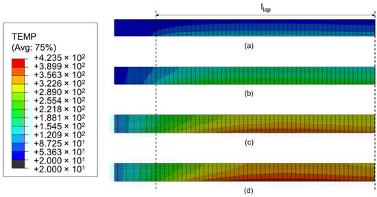 Temperature distribution in °C in the joining zone for an input power of 60 kW/m2 at (a) 3 s, (b) 10 s, (c) 20 s, and (d) 25 s.