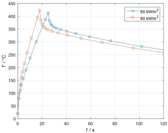 The time-temperature curve for two different power input levels for measuring point P1 is shown in Figure 5. While the melting temperature for an input power of 60 kW/m2 is reached after 25 s, it takes only 18 s for an input power of 80 kW/m2. The cooling process follows a similar course. However, comparing these data with the ones shown in Figure 5, it can be assumed that due to the thermal resistance of the material, the heat cannot be transported fast enough, resulting in a smaller melted area, as the material needs to be prevented from degradation. Such data have to be taken into account for investigating an optimal processing window for the resistance welding of thermoplastic composites. When it comes to the influence of crystallization and different heating and cooling rates on mechanical properties, the estimation of transient temperature data for the process in an early design stage plays a significant role.