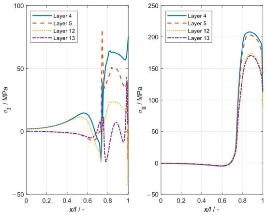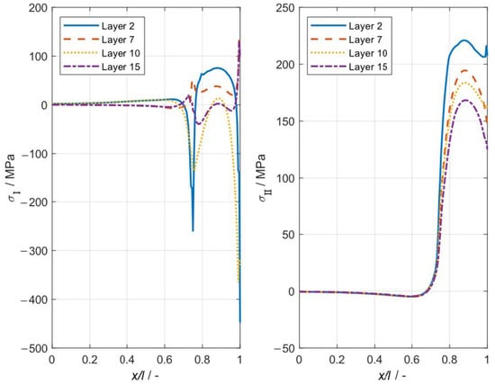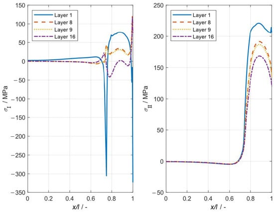 The welding process simulation is followed by a layerwise residual stress analysis. As a result of the high processing temperatures needed for the consolidation of thermoplastics, residual stresses arise and thus need to be investigated in a first step. Based on the proposed approach, the melted material sections are stress-free. The calculated residual stresses arise only due to the cooling process. Selected results are shown and discussed in the following. In Figure 6, the residual stress state of the 0° layers, with respect to the global coordinate system, along the specimen’s x-direction are presented. The data were collected in the mid-plane in the y-direction (y = 0.5w) for each layer at the center of each ply. The specimen’s free end is located at x/l = 0. The overlap-zone reaches from x/l = 0.75 to x/l = 1.