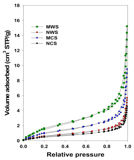 All four samples (NCS, NWS, MCS, and MWS) were characterized by N2 adsorption and desorption measurements. The specific surface area and porosity of the starch particles were examined using the nitrogen gas adsorption–desorption analyzer. A Brunauer–Emmet–Teller (BET) model was used to calculate the specific surface area. The monolayer adsorption was evaluated using the linear form of the BET equation. The BET surface area (SBET), single-point pore volume (Vsp), the volume of fine pores (Vmi), and the total pore volume (Vt) were measured using the nitrogen adsorption analyzer. Nitrogen adsorption isotherms were measured at −196 °C on an ASAP 2010 volumetric analyzer (Micromeritics, Inc., Norcross, GA, USA). Prior to the adsorption measurements, all samples were outgassed under vacuum at 110 °C for 2 h [48].