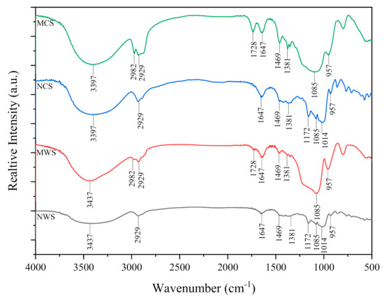 FTIR studies were conducted on all starch samples. Figure 2 shows the FTIR spectra of both native (NCS and NWS) and modified starch (MCS and MWS). All samples show broad O-H stretching bands at 3437–3397 cm−1 [50], and a band around 2929 cm−1 corresponds to the stretching vibration of the C–H bond from the glucose units; see Figure 2. Both MCS and MWS samples display a peak at 1728 cm−1 that is ascribed to the C=O group, suggesting the oxidation of alcohol to aldehyde during the hydrolysis process.