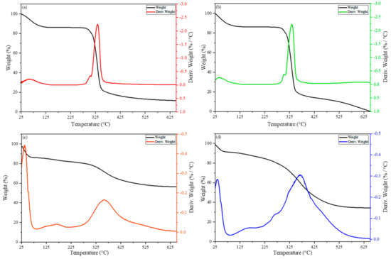 Thermogravimetric (TG) and differential thermogravimetric (DTG) profiles of (a) NWS, (b) NCS, (c) MWS, and (d) MCS samples.