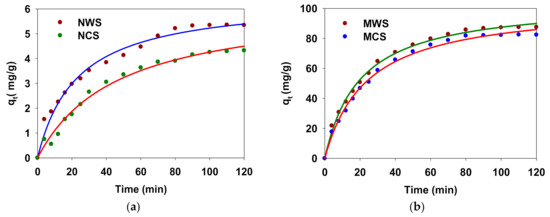 Figure 5a,b show the effect of contact time on Pb(II) adsorption capacity onto the native (NWS and NCS) and modified (MWS and MCS) starch samples, respectively. As it can be seen, Pb(II) adsorption rate initially increased rapidly during the first 30 min, and the maximum adsorption capacity was reached within 2 h for all starch samples; see Figure 5a,b. Therefore, the Pb(II) uptake occurred in two steps. The initial rapid adsorption of Pb(II) is due to the availability of a large number of sites, and the subsequent slow adsorption process is attributed to the unavailability of sites that decreases over time. The NCS and NWS show relatively small adsorption capacities (qt) of 4.32 and 5.34 mg/g, respectively. Interestingly, the adsorption capacities for modified starch samples, MCS and MWS, are ~16 and 19-fold greater as compared to the unmodified (NCS and NWS) samples. The adsorption capacities of MCS and MWS are 82.35 and 87.48 mg/g, respectively.