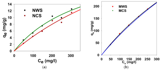 The plots of the linearized form of pseudo-second-order model (t/qt vs. t) are depicted in Figure S2a,b, Supporting Information. Table 4 summarizes the kinetic parameters calculated from the pseudo-second-order model and the correlation coefficients (R2) for all plots. Data fitted well to the pseudo-second-order model with the correlation coefficients over 0.98 (R2 ≥ 0.98); see Table 4. The linearity of these plots indicates the applicability of this model. Therefore, our data suggest that the adsorption process occurs via a chemisorption mechanism. As can be seen from Table 4, the MWS sample shows the maximum concentration adsorption rate (h) of 5.52 mg·g−1·min−1.