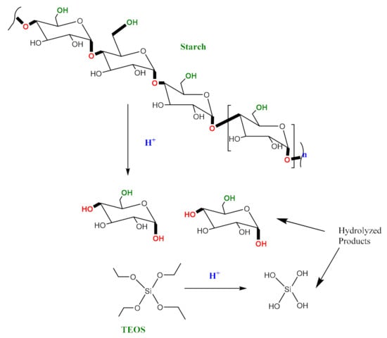 Hydrolysis of starch and tetraethylorthosilicate (TEOS).