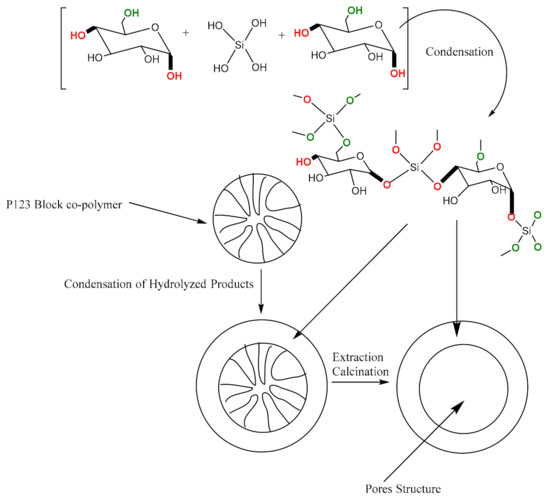 Synthesis of the modified starch involves the hydrolysis and condensation steps, as shown in Scheme 1 and Scheme 2. The structure-directing agent, Pluronic 123, is a block-copolymer containing hydrophilic ethylene oxide (EO) and hydrophobic propylene oxide (PO) parts. During the synthesis, both starch and TEOS are hydrolyzed under acidic conditions; see Scheme 1. Due to the hydrophilic and hydrophobic nature of P123, it forms micelles. Hydrophilic part of the P123 and condensation product formed from the reaction between the hydrolyzed TEOS and starch have weak electrostatic interaction through hydrogen bonding. The micelles formed by P123 are subsequently removed with acidic ethanol to enhance porosity, as illustrated in Scheme 2.