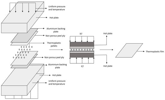 The thermoplastic films used in this study were fabricated from EVA pellets using a hot press. The schematic of the thermoplastic film fabrication is shown in Figure 1. In the first step, thermoplastic pellets were spread evenly on a non-porous sheet placed over an aluminum backing plate free of surface defects. It transmitted normal pressure and temperature and provided a smooth surface on the finished thermoplastic film. Another non-sticky ply and a plate was placed over the evenly spread pellets.