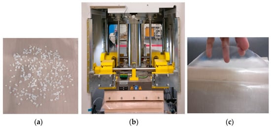 (a) Thermoplastic pellets; (b) Pellets being compressed in a hot press; (c) Fabricated thermoplastic film.
