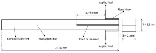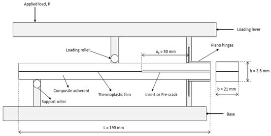 A non-adhesive insert was placed on the midplane to act as a delamination initiator. Piano hinges bonded to one end of the specimen were used to apply opening forces perpendicular to the specimen face avoiding any moment at the point of loading. A uniform displacement rate of 1 mm/min was set for all the specimens so that steady crack propagation was ensured. The MMB specimen under test and the schematic of the specimen are shown in Figure 8 and Figure 9 respectively.